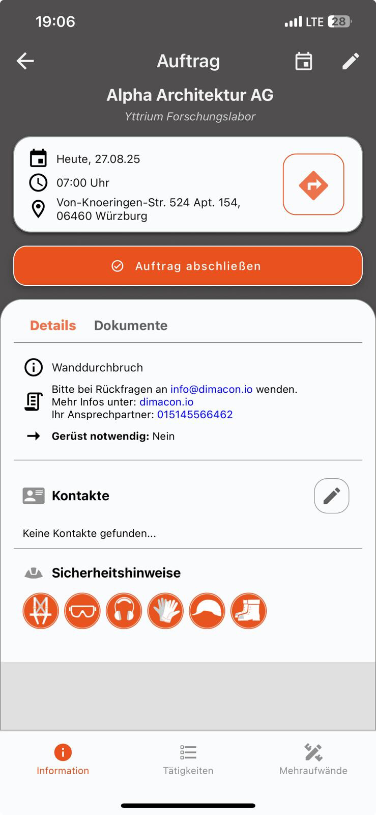 Telefonnummern, Webseiten oder E-Mail-Adressen, die im Feld „Weitere Informationen“ eines Auftrags hinterlegt werden, sind ab sofort klickbar. So können Sie direkt die passende Standard-App (z. B. Telefon, Browser oder Mailprogramm) öffnen, ohne die Angaben manuell kopieren zu müssen.
